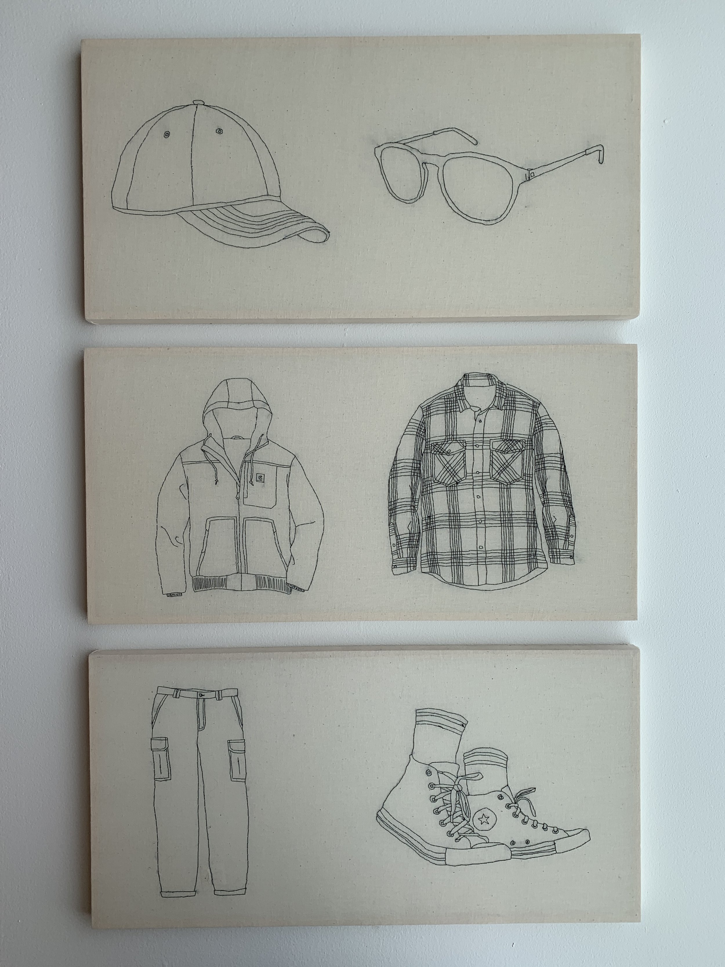 For queer and gender non conforming people, something as deceivingly simple as the length of a coat or the cut of jeans can be what allows someone to go through their day confidently feeling like themselves. When this is taken away or denied, it can be devastatingly painful. These panels feature hand-stitched images of different clothes that comfort and affirm me. With each tiny stitch, I hold on to that joy and to the cultural signifiers that have passed through queer generations. In the face of national threats to our communities, these clothes are not just clothes and never have been.